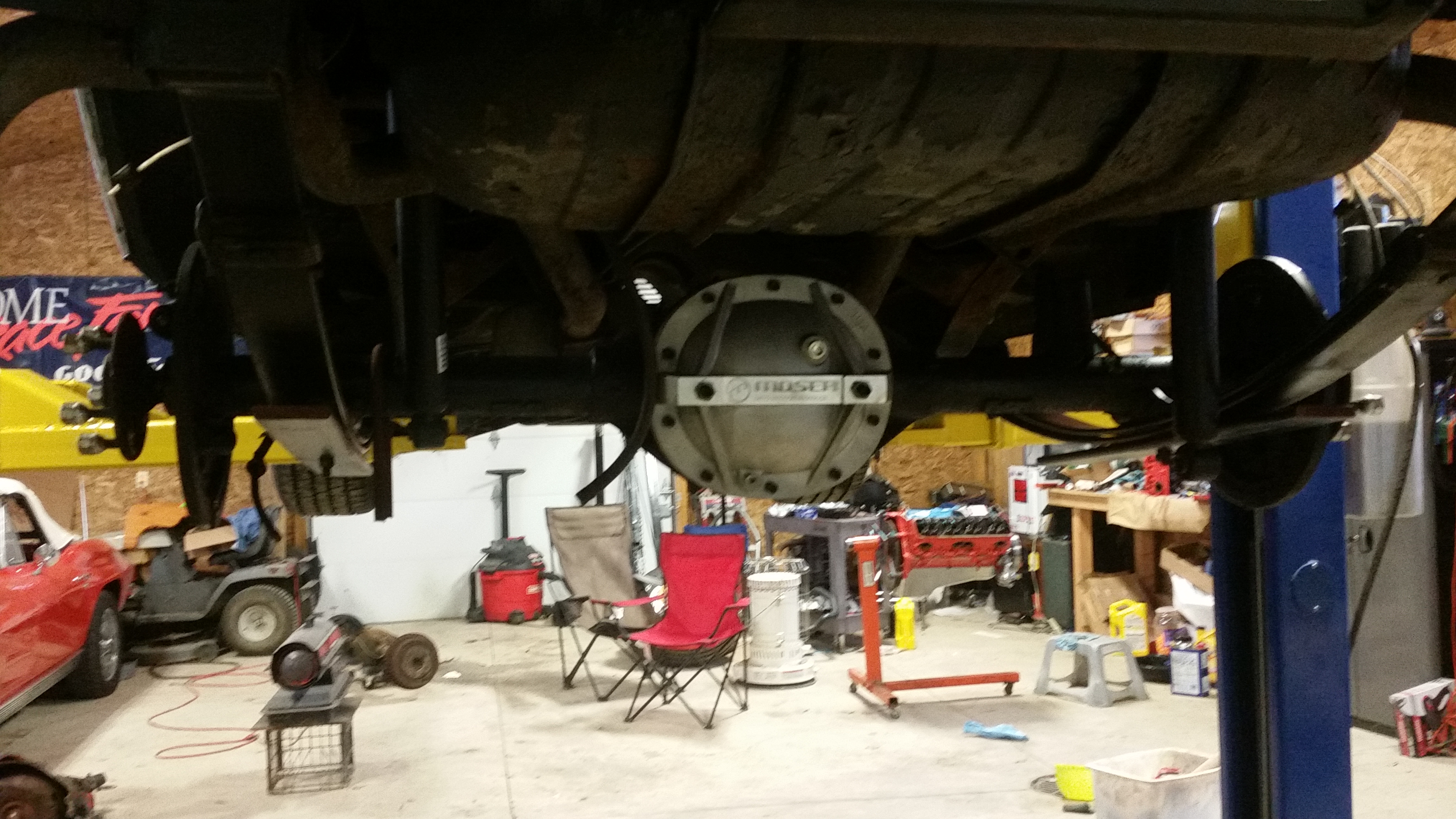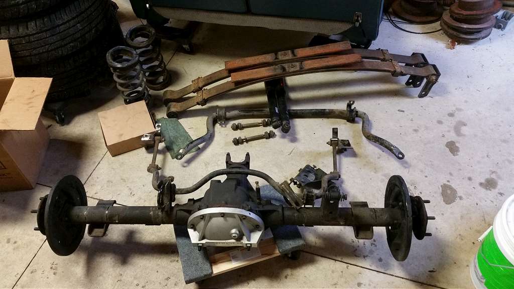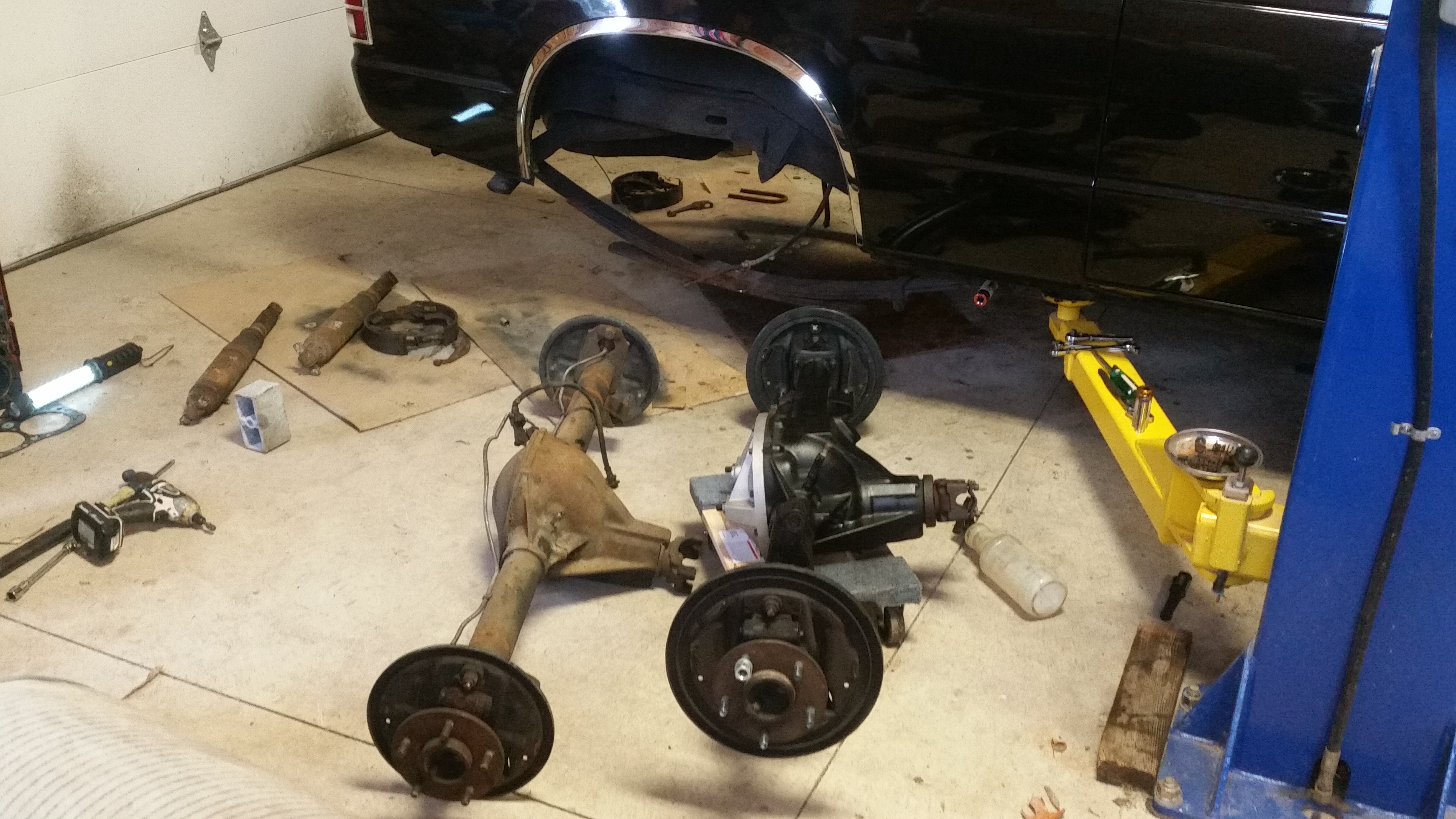 I had a productive day in the garage today. BP came over and we made some significant progress on the rearend swap. We got the old one without too much hassle. Ended up cutting the axle U-bolts when my impact gun would only take off one on each side. No biggie, because the old ones would've been much too long since I won't be using the lowering blocks anymore.
