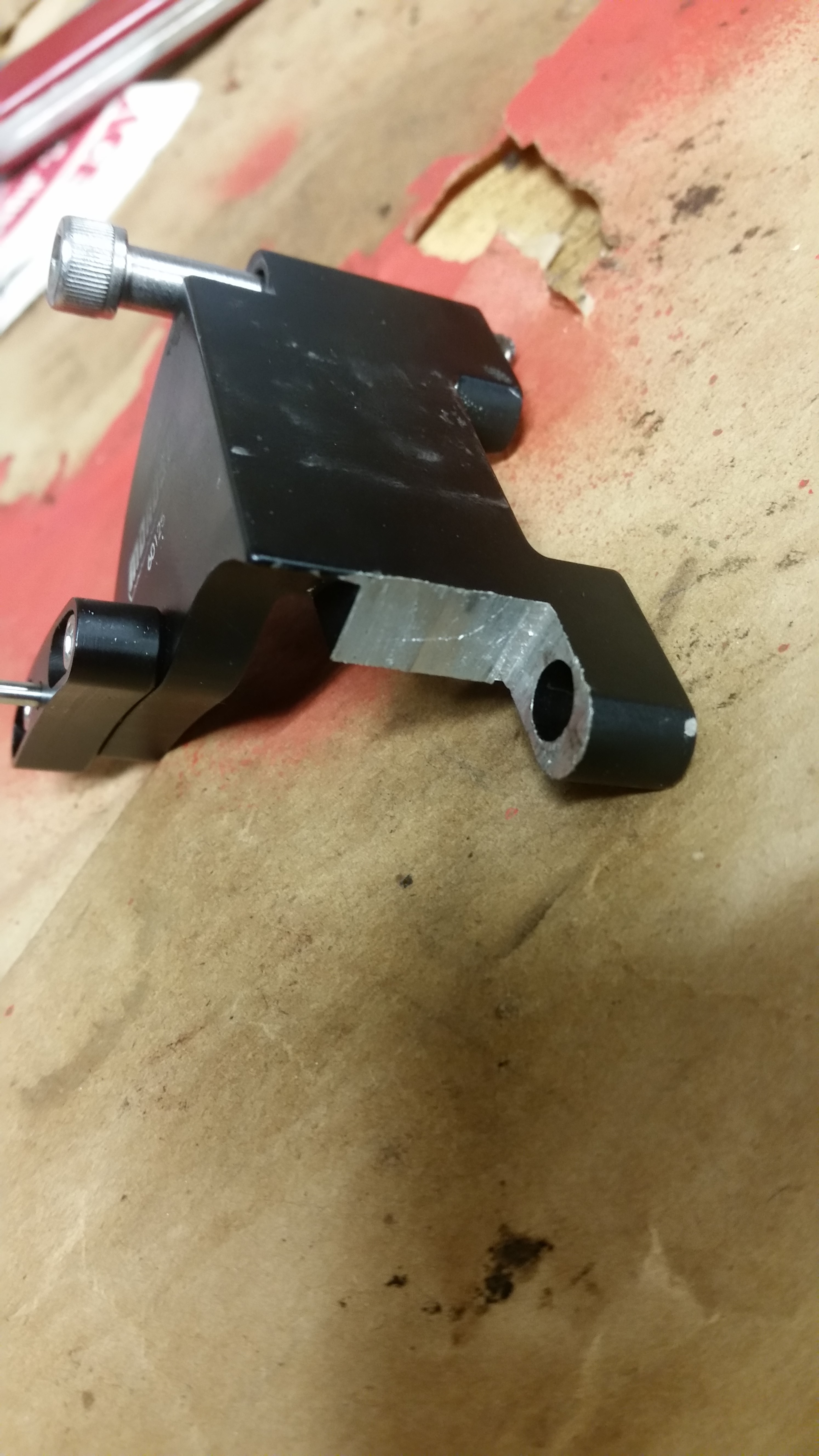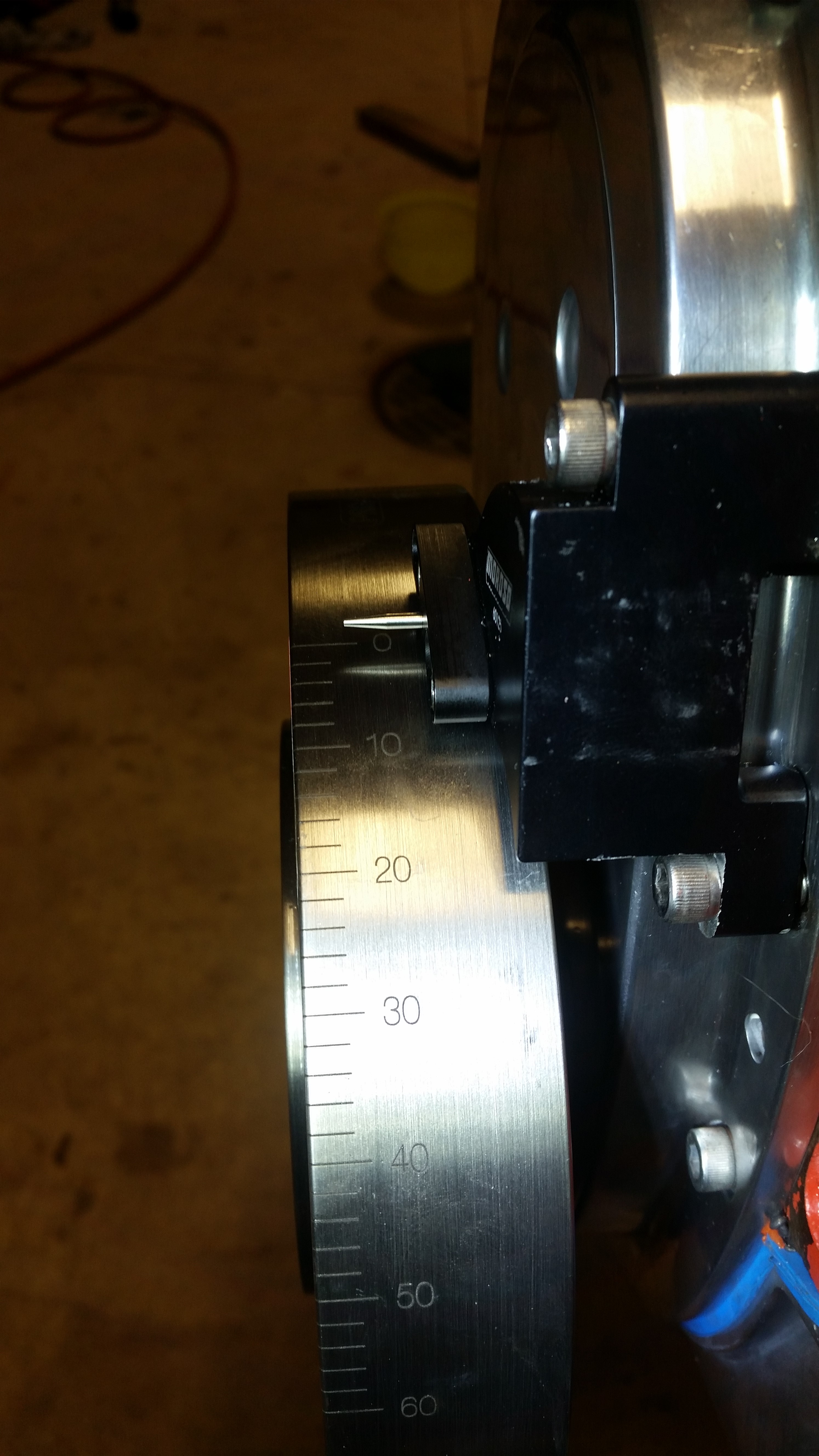 Chris came over and while trying to mount the pointer, it wouldn't sit flat on the cover because of the radius at the cover's flange. Grrr.. so, he did some clearancing on the pointer while I was still working on the rear brakes. After he finished, we were drawing the balancer onto the crank it got tighter at one point, but it clearly wasn't fully on. Just figured it was tight, being new. I was using a breaker bar, and it lived up to the name -- I broke my installation tool after not seeing that the balancer was hitting the lower mounting screw for the new pointer. Caught us both by surprise. It just barely didn't clear and left a little ding on the balancer. You can see it right behind the "1610" marking.