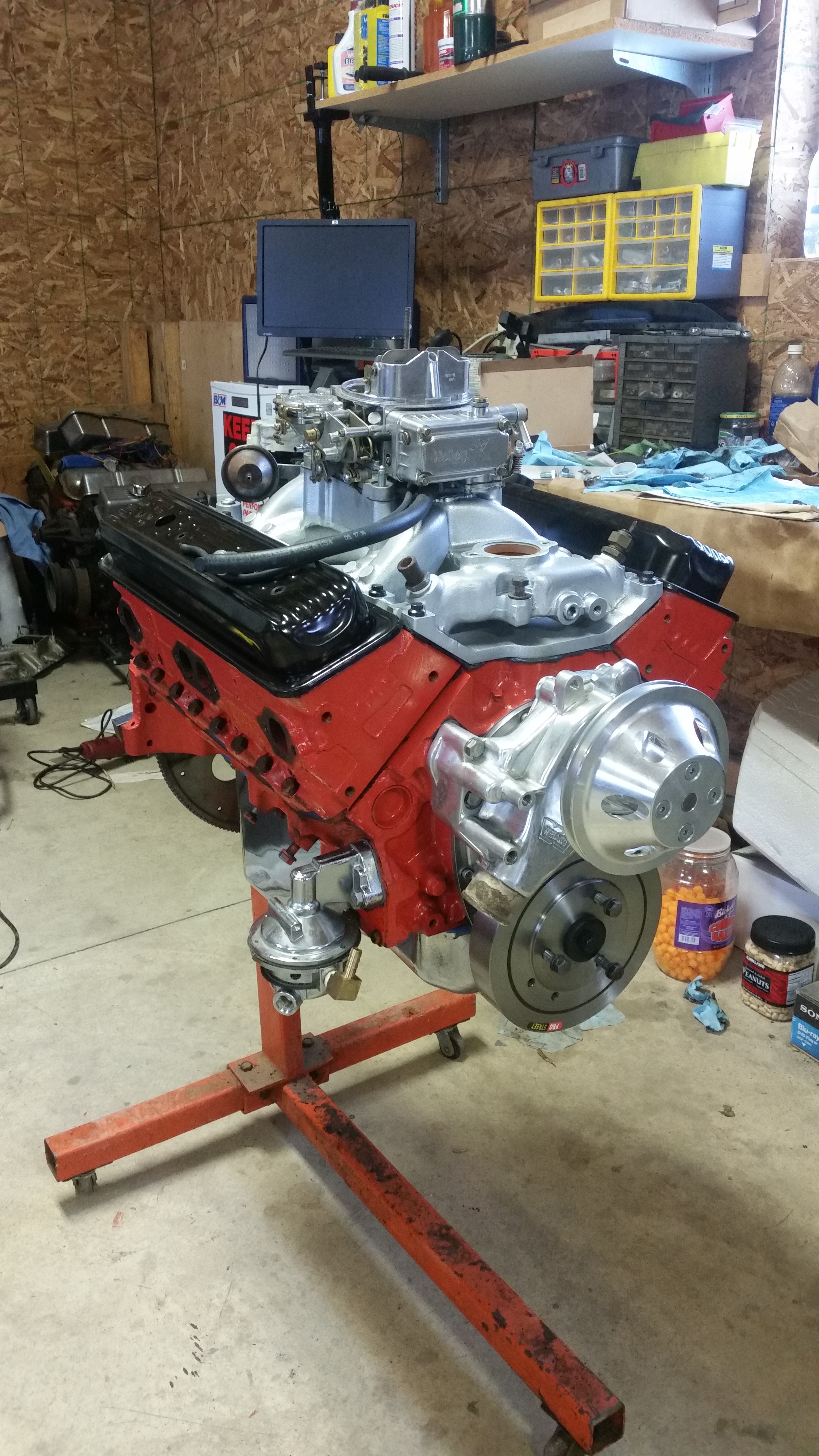 This past Sunday, while watching the final hour of Rolex 24 @ Daytona, Chris came over again we bolted on the heads, the intake, installed the lifters, and adjusted the valves. I attached the water pump, carb, and distributor to take a picture, but they'll come back off when I set the engine back in the truck, but it's ready to go back in!!
