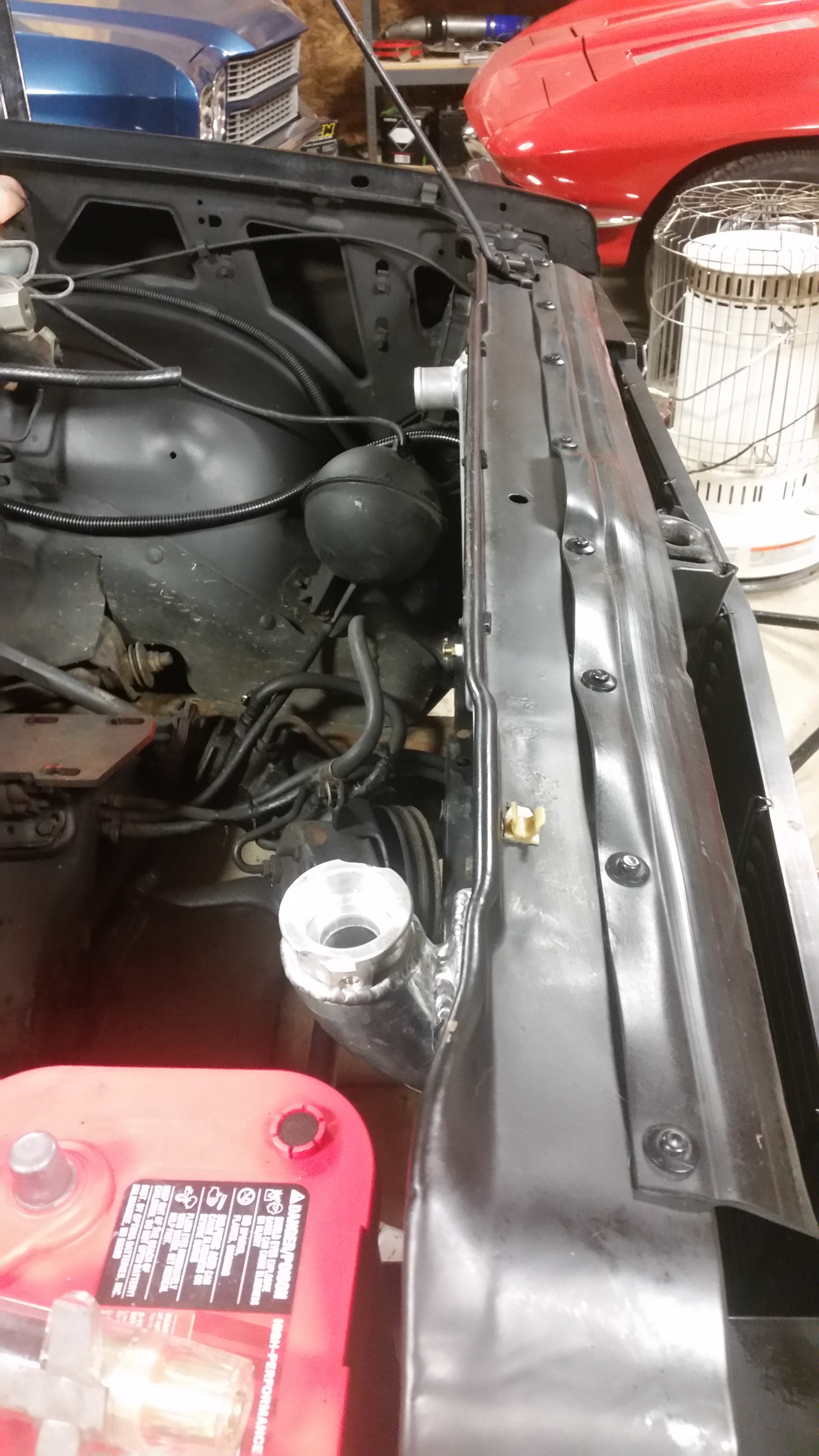 I removed the A/C condenser and ordered a radiator that could sit farther forward into the core support. After seeing Paul's radiator plus a few others on v8s10.org, I took my brand new aluminum radiator to a welder and had the neck modified. I was nervous how it was going to turn out since it was certainly not returnable any more. I think it came out great. And I think I should have enough room for a puller-fan.