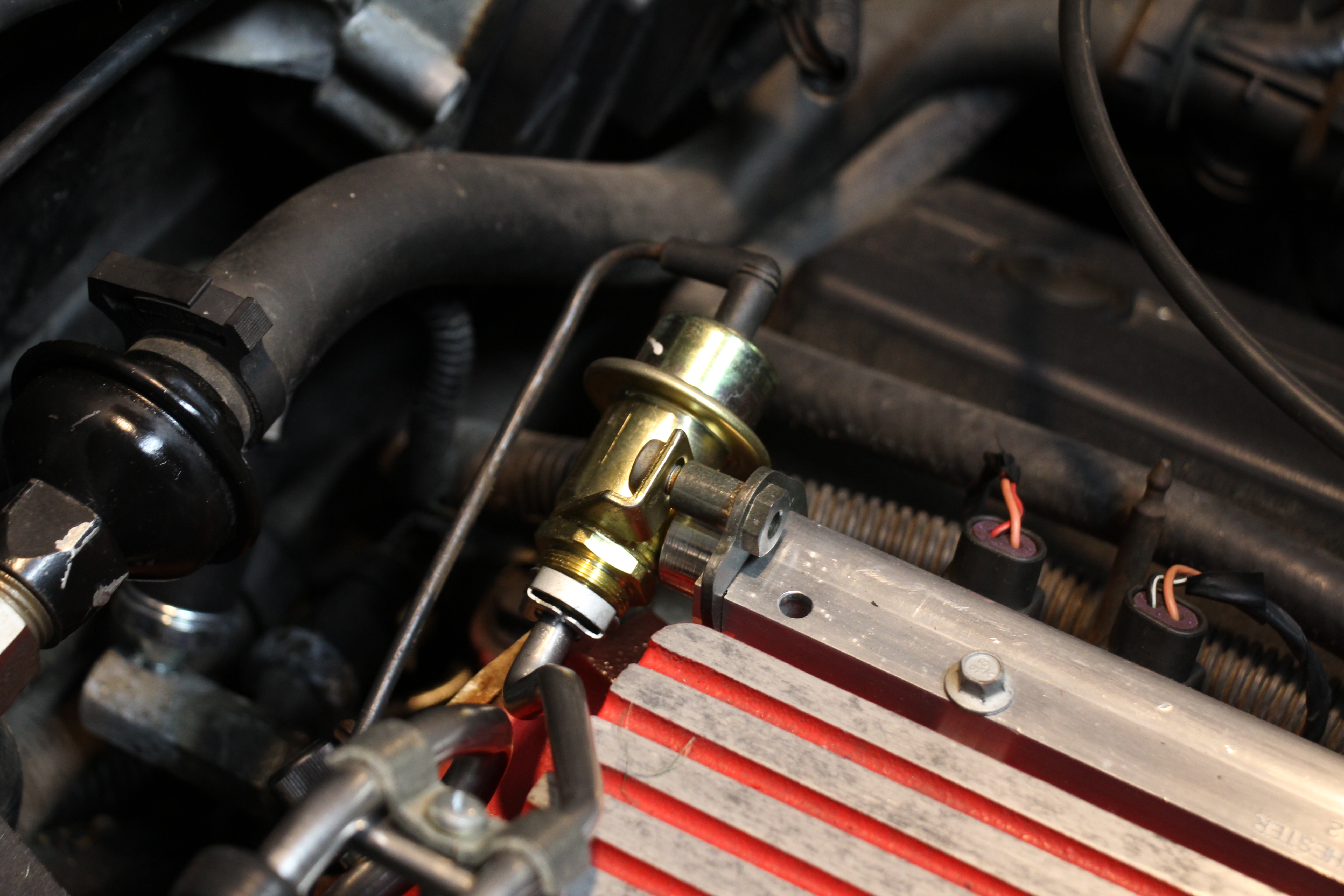 3) I also installed a fuel pressure gauge on the test port of the fuel rail and saw that the fuel pressure is lower than it should be. At Maverick's suggestion, I pinched off the return line at the tank and ran the pump. I got 90 psi at the fuel rail so the pump is good so that leaves the fuel pressure regulator as the source of the problem. I just ordered a Holley adjustable fuel pressure regulator. I'm expecting it next week. Perhaps more fuel pressure will fix the stumble. Fingers crossed.