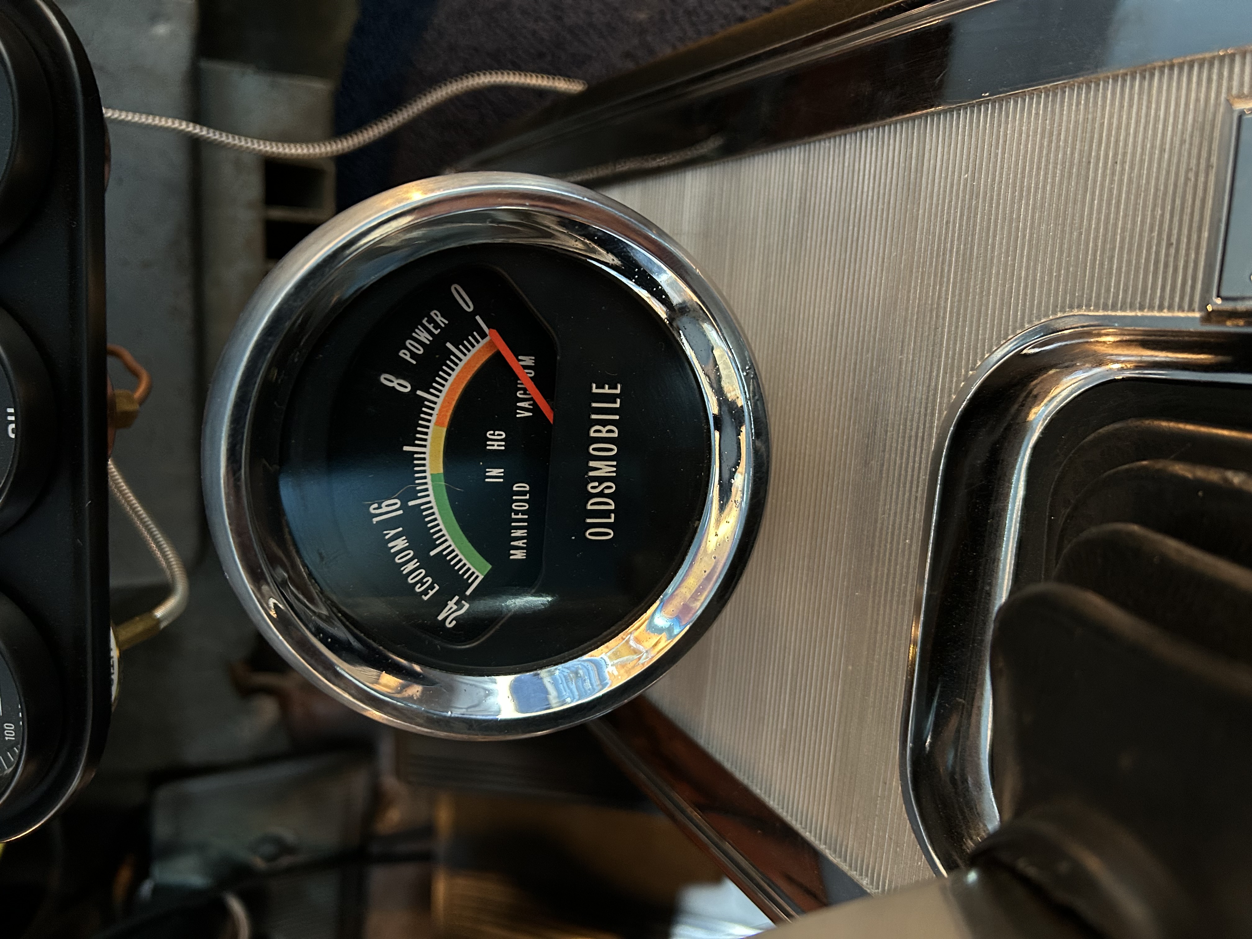 41,000 …. I found a sweet deal on Ebay on a factory vacuum gauge for the 442. For under $100 I got the gauge shipped to me and purchased the new vacuum hose and the brass fitting to connect the hose to the intake manifold. It took me a couple of hours to do the install, but when I was done it worked 100% on the initial start up. The gauge is super clean and adds a bit of color to the interior of the car. I like the look and it was a pretty painless project.
