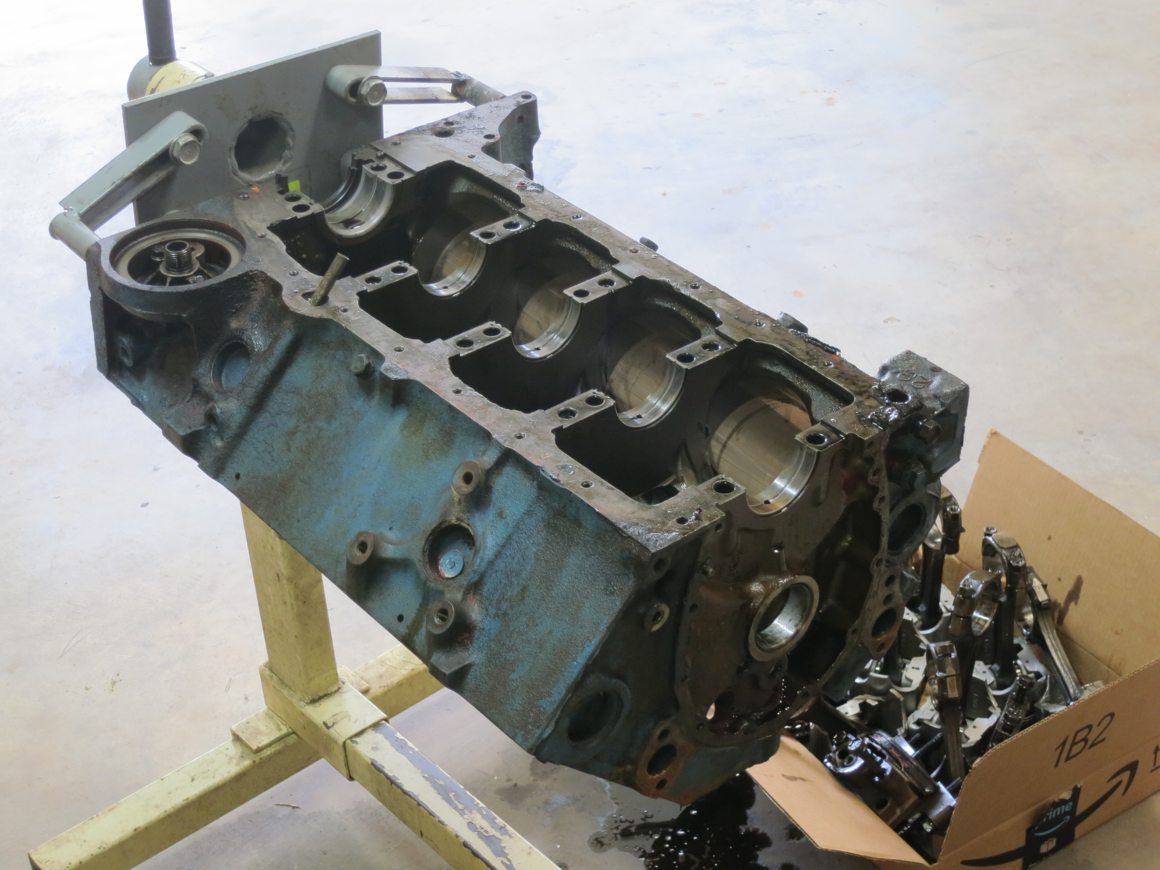 We started the process today. Tore it down. Bore is 4" so it IS a 350. I ASSUMED it was a 350 based on what the seller told me. He was relying on the word of the previous seller. Four bolt mains. Two piece rear seal. Need to determine if the crank is a "big journal" crank. No indication of overbore or undersized bearings but we'll mic everything out before we order parts. Bearings look good. No noticeable ridge on the cylinders. Some cross-hatch is still there but there is very minor scoring. Hone should put it in good shape. Cam and lifters don't show wear so we'll reuse them. Timing chain is a little loose so we'll replace it.