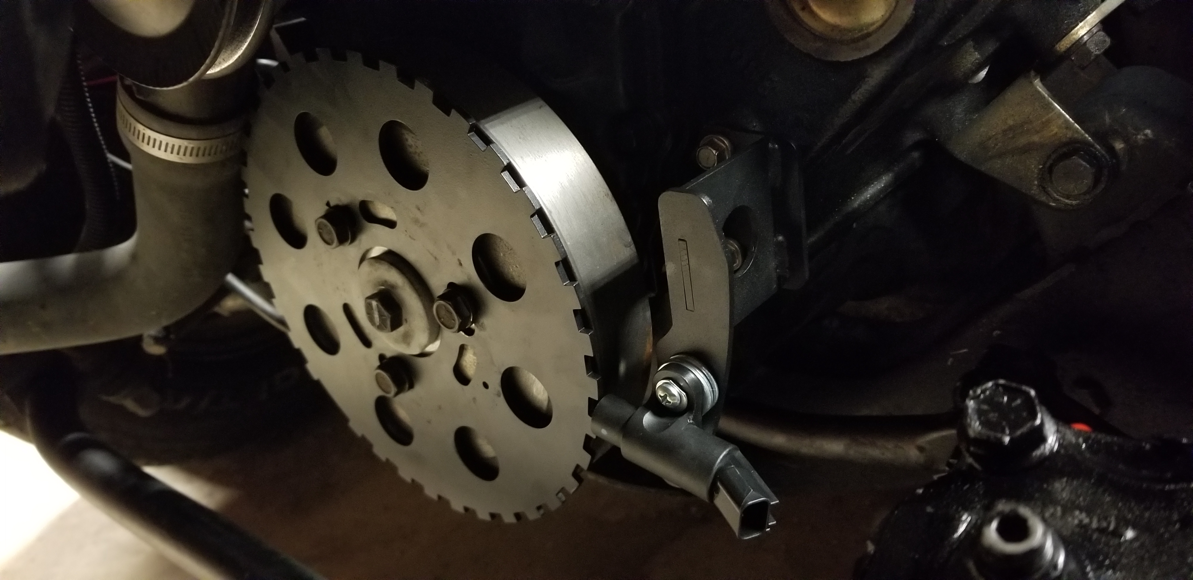The wheel and the mounting bracket were purchased on ebay for like $55. I think it's just some guy who makes them in his basement, but so far it works great. The bracket is designed to use the crank position sensor from a '91 Escort 1.9L. It's a simple 2-wire VR sensor. I set the air gap at .9mm