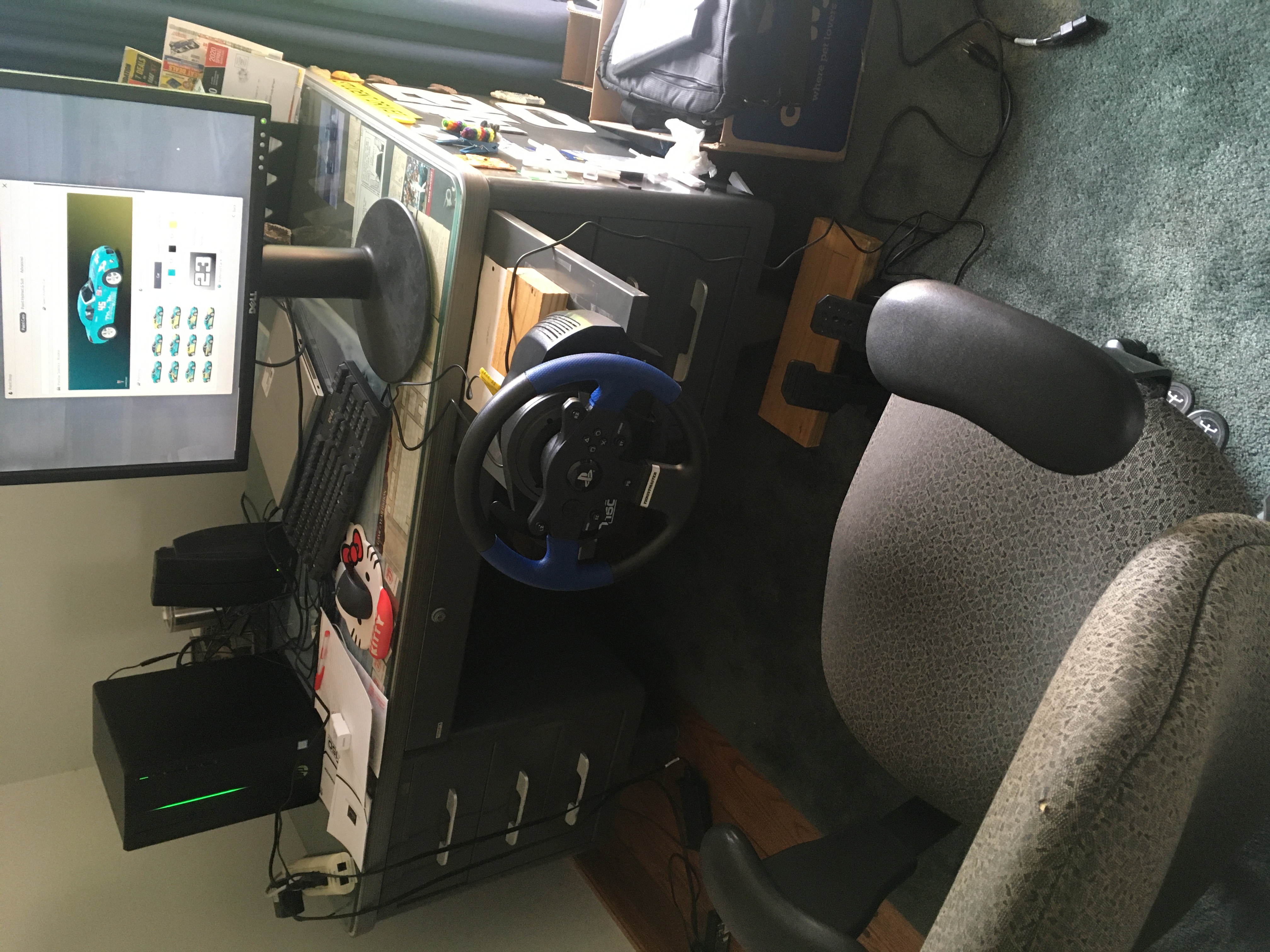 Over the winter break between seasons I upgraded to triple 27" monitors and 32gb RAM. I also moved the whole set up left on the table for easier entrance. My feet were catching on the right table leg a bit.