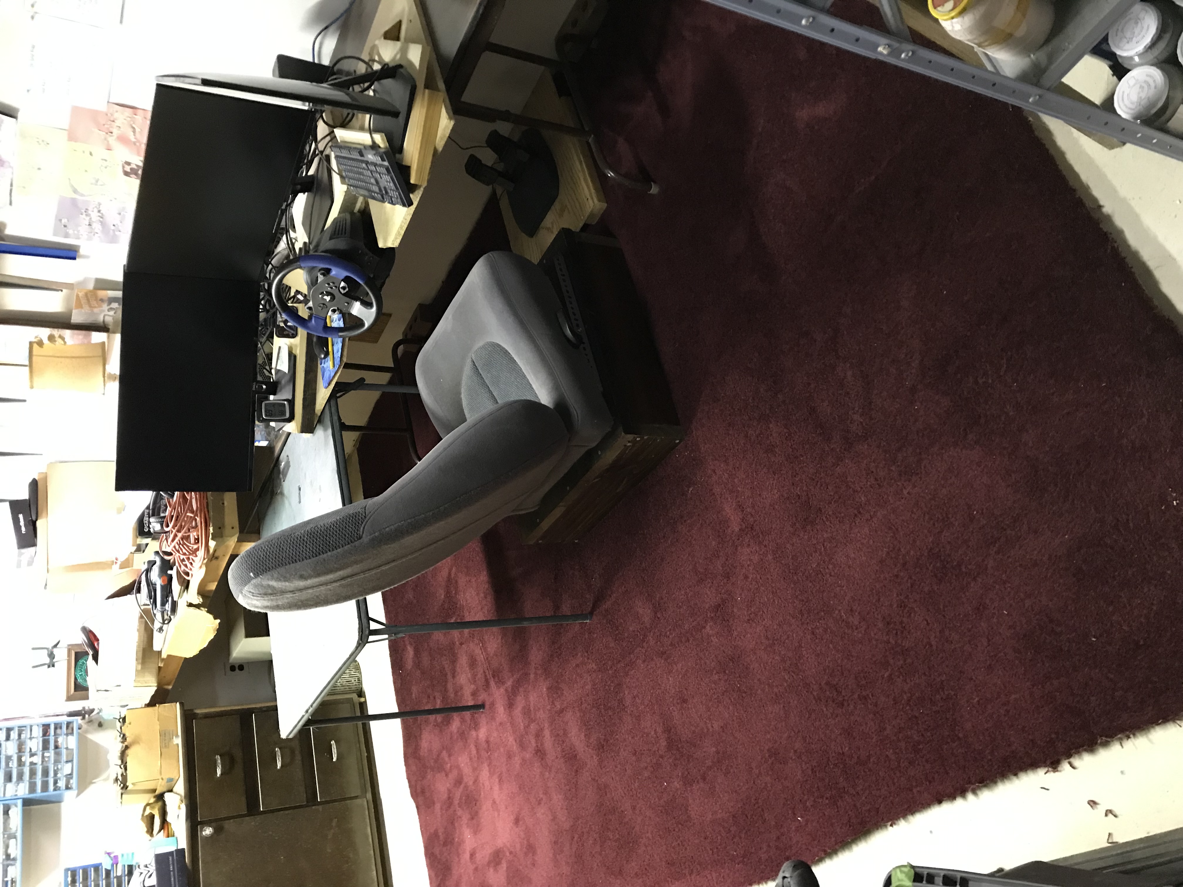 1) Cleaned out the space, moved in the new table. it is 1" higher than the card table. Had to cut the metal support under the table so the sim racing wheel could clamp down properly on the table, and shorten the wood block spacer for the pedals by 3". The spacer is temporary but it does a decent job keeping the pedals from moving away from you when you press on them
