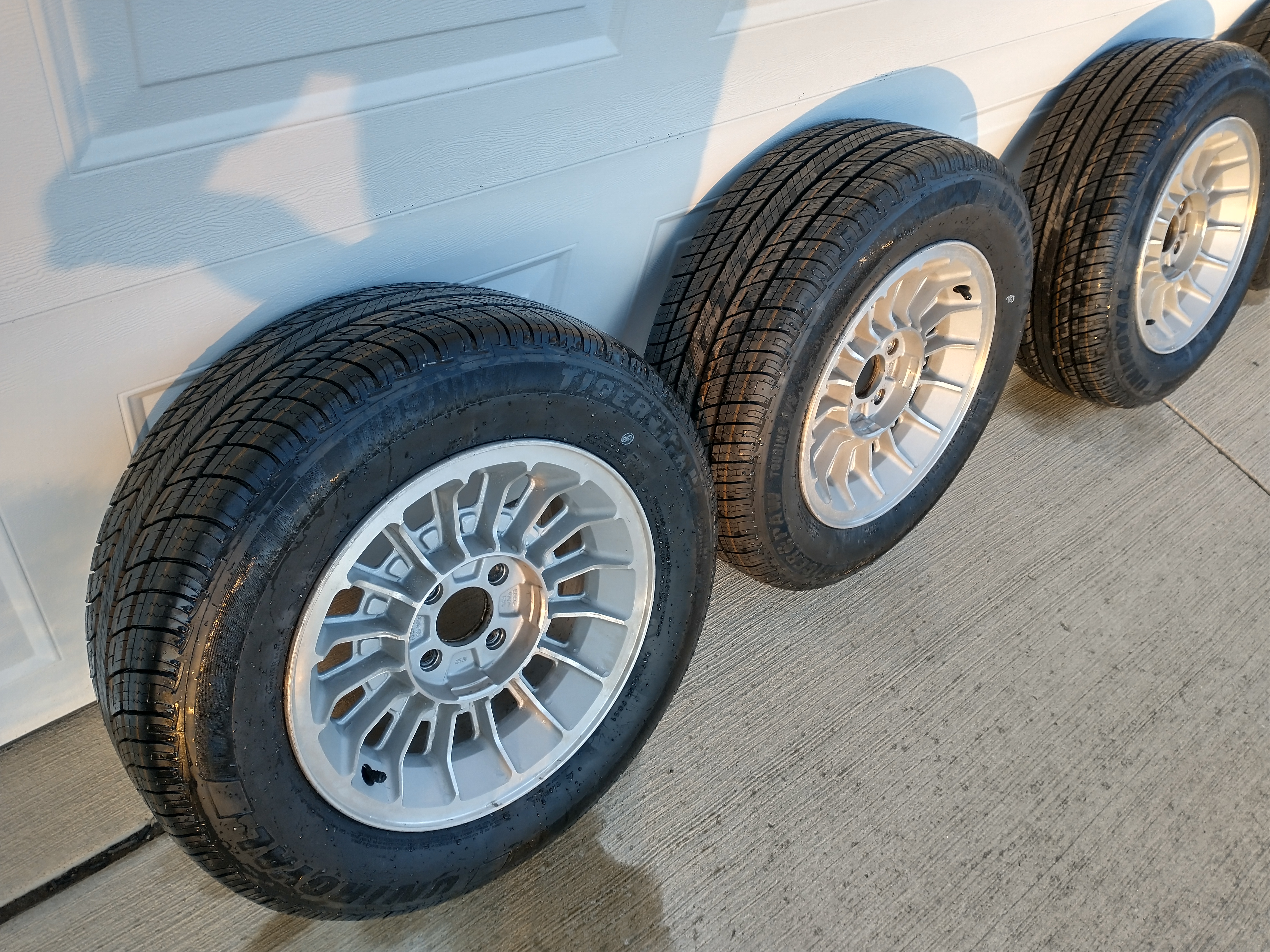 New Uniroyal Tiger Paws installed and I cleaned the wheels too. They're not perfect, but there's no clear coat pealing or anything like that. The weather should be good enough this week to take it back to storage and hopefully get the detail job done.